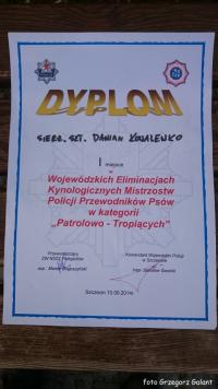 Funkcjonariusz Policji sierżant sztabowy Damian Kowalenko oraz jego partner o imieniu Rambo osiągnęli sukces. Policjant oraz jego podopieczny wzięli udział w eliminacjach kynologicznych organizowanych wyłącznie dla psów policyjnych. Forma oraz przygotowanie techniczne uczestników są oceniane na poszczególnych szczeblach zawodów od regionalnych, poprzez wojewódzkie, aż do szczebla centralnego mistrzostw policji. W dniu 10.09.2014 Damian Kowalenko oraz jego pies Rambo zajęli 1 miejsce w Wojewódzkich Eliminacjach Kynologicznych Mistrzostwach Policji Przewodników Psów w kategorii Patrolowo - Tropiący. Konkurencje w eliminacjach wojewódzkich były bardzo trudne i wymagające dla wszystkich . Świetne przygotowanie pozwoliło tylko najlepszym z najlepszych przejść przez wszystkie próby. Zadania, które zawodnicy mieli do wykonania to między innymi agresja w kagańcu i bez kagańca, tropienie i posłuszeństwo .Rambo uzyskał doskonały wynik 360 na 400 możliwych do uzyskania punktów.