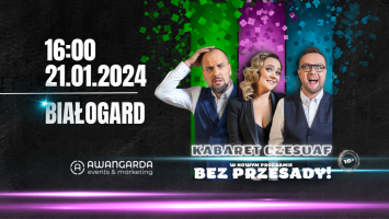 KABARET CZESUAF rusza w Polskę. Poprzedni program „Skandal!” obejrzały tysiące widzów, mamy nadzieję, że nowe skecze znajdą jeszcze większe rzesze odbiorców. Może nawet miliony? Bez przesady! Właśnie taki tytuł nosi nowy program Czesuafów. „Bez przesady!” to próba zmierzenia się z tym, co widzimy dookoła siebie. Dlaczego wszystko wyolbrzymiamy? Polscy piłkarze przegrają mecz – „klęska”, „tragedia”. Iga Świątek wygra – „miazga”, „pogrom”. A powiedzmy sobie szczerze, najczęściej w Polsce jest po prostu średnio. Za to na pewno średni nie jest nowy program kabaretu Czesuaf, bowiem Olga, Tomek i Maciek dają z siebie na scenie wszystko, a nawet jeszcze więcej. Recenzje widzów nie kłamią – program kabaretu Czesuaf to dwie godziny zabawy na najwyższym poziomie! To będzie naprawdę niezapomniany wieczór... Chyba że zagramy po południu, to wtedy niezapomniane popołudnie. I mówimy to bez przesady!