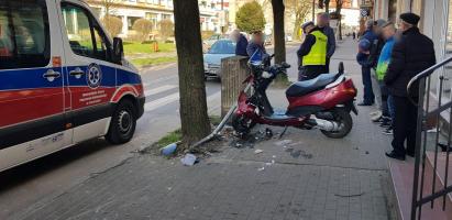 Mężczyzna jadący skuterem na prostym odcinku drogi zjechał na pobocze, stracił panowanie nad pojazdem i z impetem uderzył w drzewo i znak drogowy. Prawdopodobnie w tym zdarzeniu brał udziału inny pojazd.