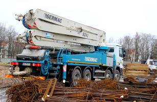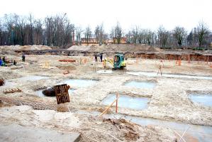 Dookoła tony ciężkiego sprzętu. Ciężarówki, koparki, betoniarki, koparko-ładowarki, pompa do betonu, a nad tym wszystkim króluje wieżowy żuraw. W ogromnej niecce, z której niedługo zacznie „wychodzić” basen, budowlańcy leją fundamenty – stopy, ławy. Z dołu ku górze wystrzeliwuje gęstniejący z dnia na dzień las prętów zbrojeniowych. Ta część robót potrwa do połowy marca, do zrobienia jest bowiem ponad 100 stóp fundamentowych! Równolegle odpompowywane są wody gruntowe. Wokół niecki mnóstwo piramid z piasku, który w stosownym momencie użyty zostanie do obsypania fundamentów. Natomiast są już przygotowane sieci zewnętrzne – kanalizacyjna i deszczowa. Gotowy jest rurociąg wodociągowy. Za chwilę powstanie studnia wodomierzowa. Dynamika prac jest imponująca.